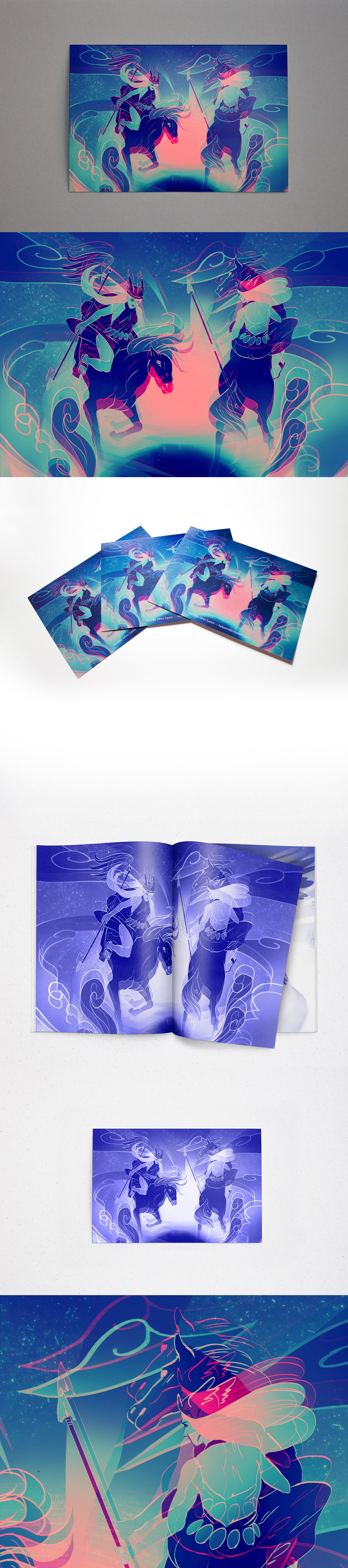 An illustration showing the valkyries, made for a god-themed zine. The zine will be printed in blue tone, so there is a full- and single color of the illustration. It was also used on postcards to promote my work.